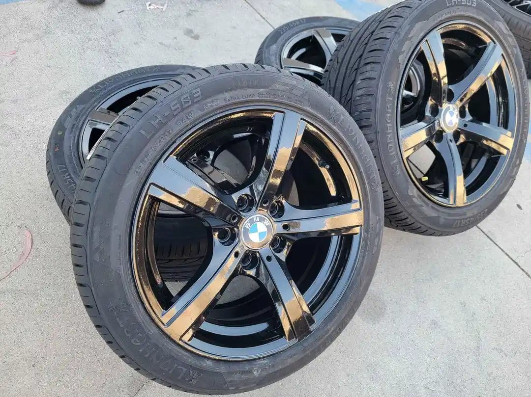 Complete your BMW 325i’s look with these brand new 17-inch gloss black wheels paired with fresh tires – ready for immediate installation.